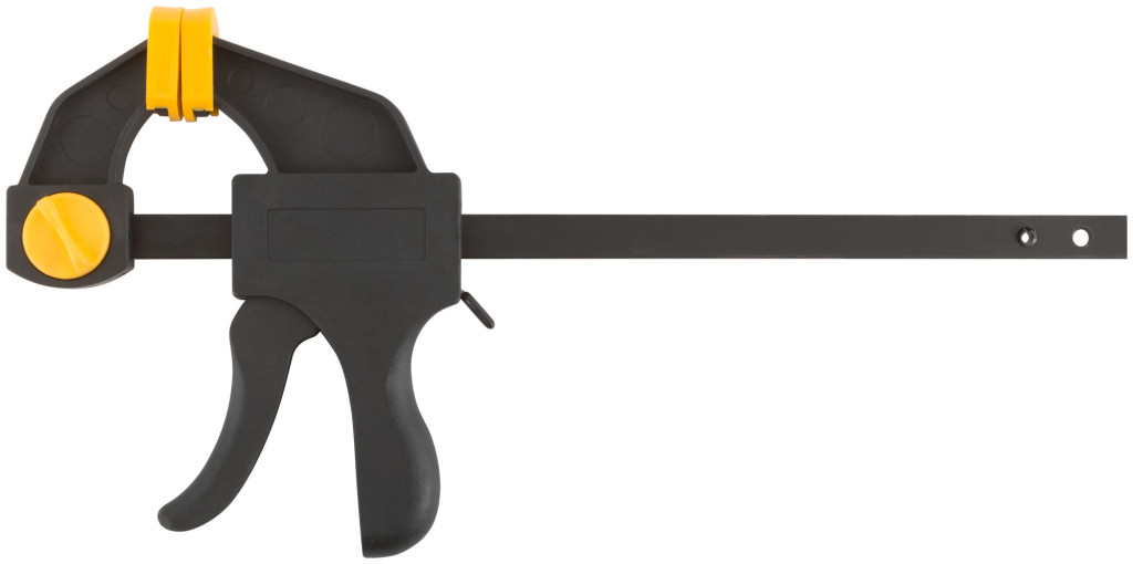 Быстрозажимная. Для фиксации деталей. Может использоваться как распорка при перестановке губок. Материал: нейлоновый корпус, армированный фибергласом, направляющая из инструментальной стали, пластиковые губки.